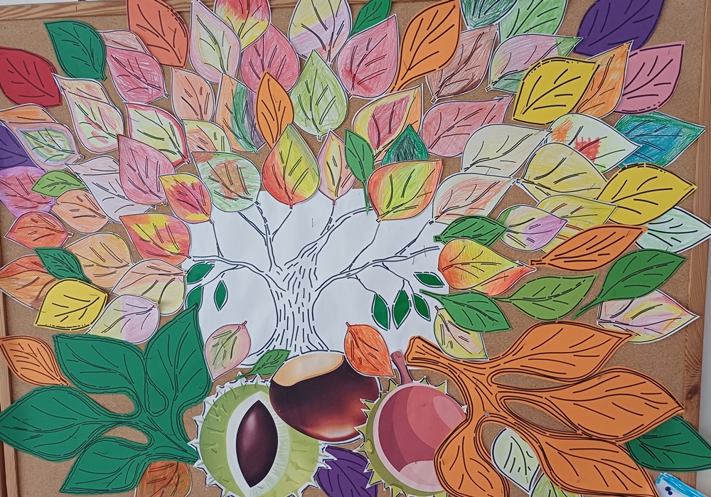 - Pracę zbiorową "Jesienne drzewo" – kolorową kompozycję stworzoną przy użyciu rysunku i elementów wyklejanych.