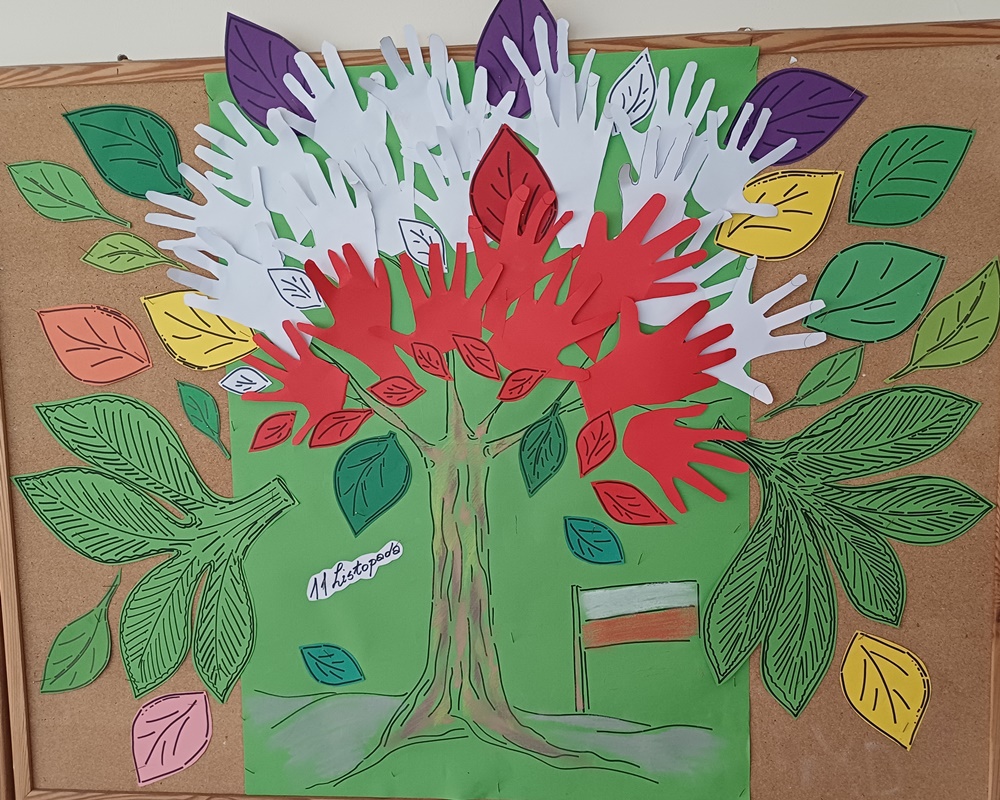 Pracę zbiorową "Święto Niepodległości" – wykonaną w barwach narodowych, łączącą technikę rysunkową i wyklejaną.