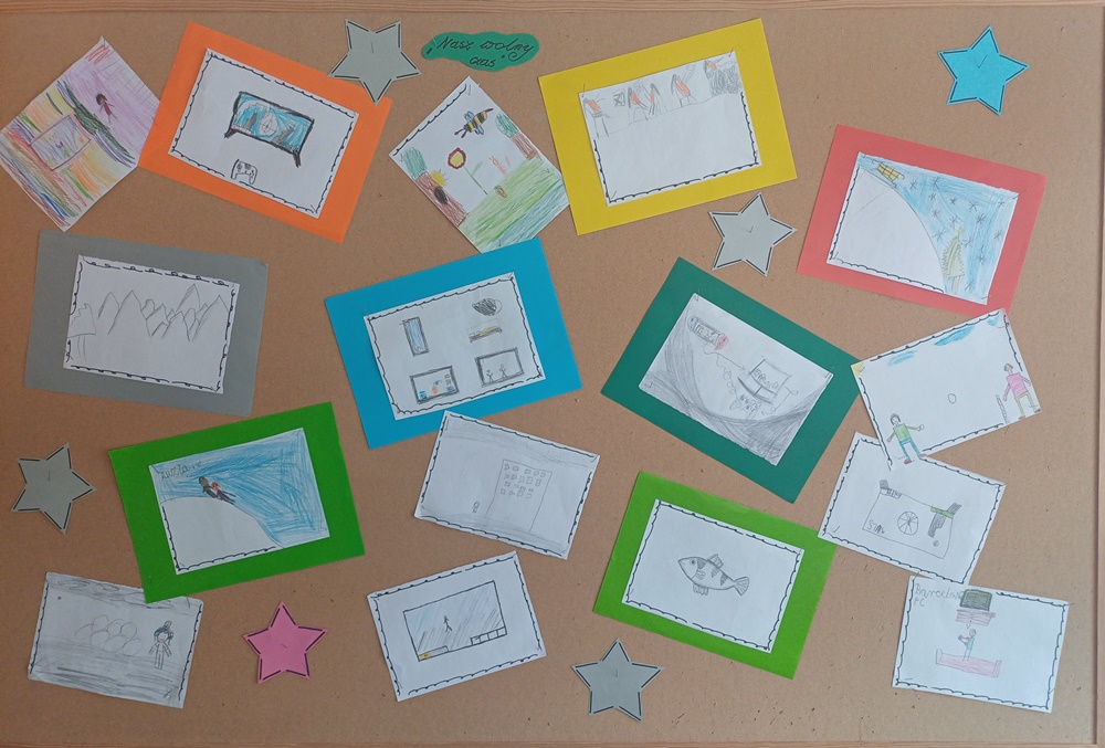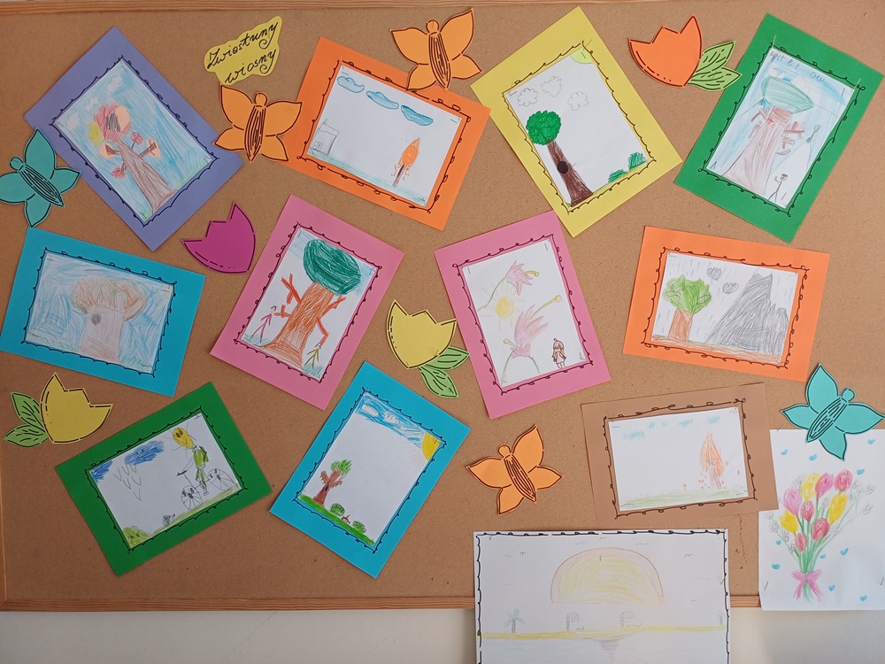 Prace plastyczne wykonane przez uczestników świetlicy szkolnej w rysunkowej technice plastycznej. Wystawa obejmuje prace powstałe w ramach trzech tematów: "Nasz wolny czas", "Mój kolega, moja koleżanka" oraz "Zwiastuny wiosny". Rysunki ukazują zainteresowania dzieci, ich relacje z rówieśnikami oraz obserwacje budzącej się do życia przyrody.